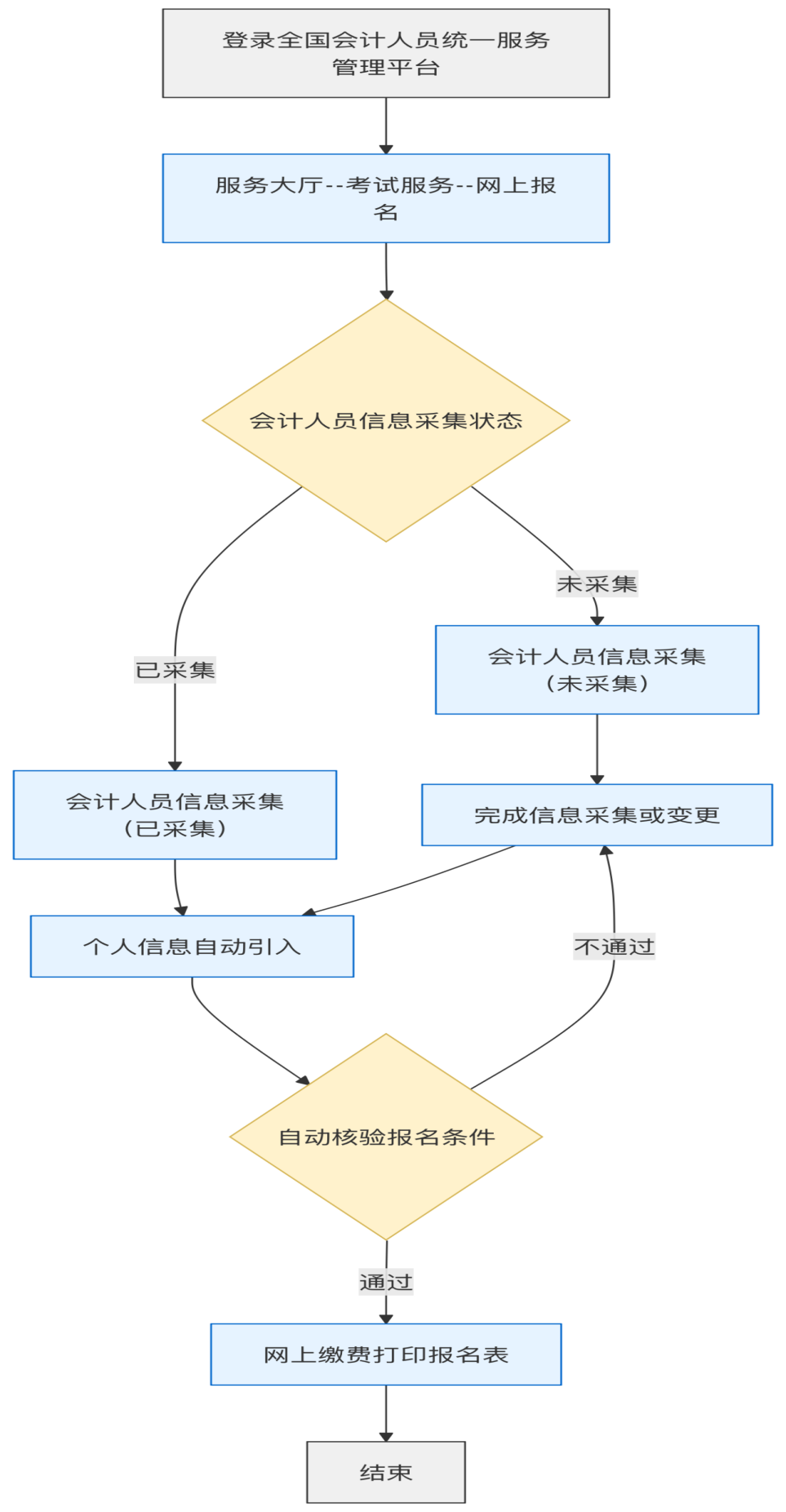 (二)信息采集。为确保顺利报名,即日起拟报考人员可登录“全国会计人员统一服务管理平台”提前进行注册和信息采集。已经完成采集的人员,在考试报名开始后无需重复上传资料,直接报考相应层级的考试科目。